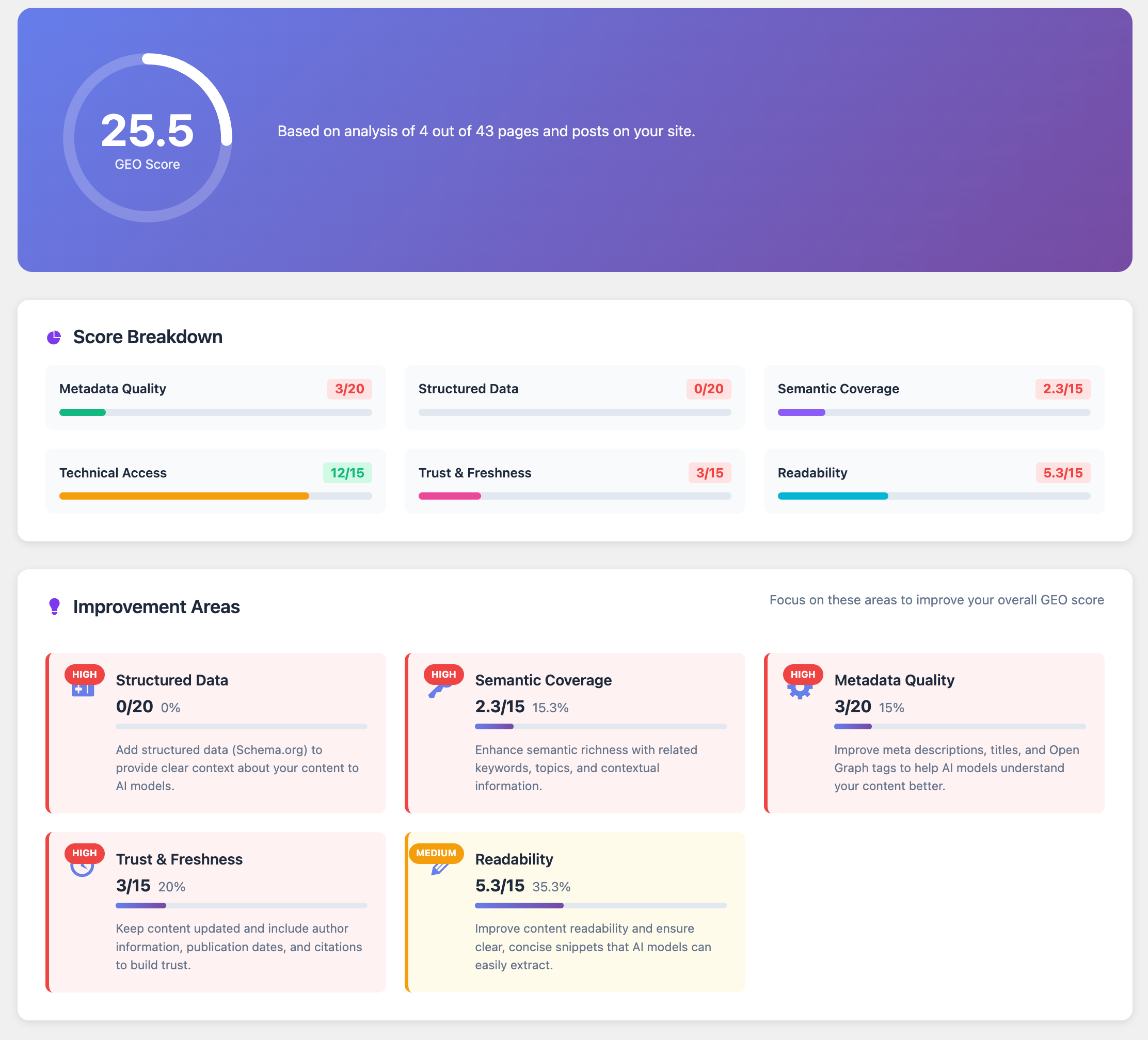 GEO (Generative Engine Optimization) score measures how well your content is optimized for AI model discoverability. It evaluates metadata quality, structured data, semantic coverage, technical accessibility, trust & freshness, and readability.